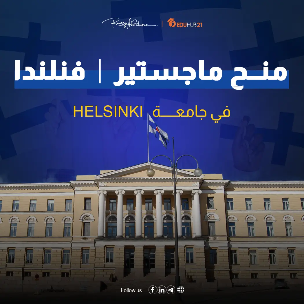 تعتبر جامعة هلسنكي في فنلندا هي اكبر واقدم جامعة في اوروبا وهي واحدة من افضل الجامعات في العالم. تضم 11 كلية و11 معهد بحثي وتقدم درجات في مختلف المجالات العلمية والإنسانية. تعتبر جامعة هلسنكي مؤسسة بحثية رائدة على الصعيد الدولي وعضو في العديد من الشبكات الجامعية العالمية وتوفر الان منح دراسية تغطي كامل مصاريف الدراسة لحوالي 35 برنامج ماجستير باللغة الإنجليزية.