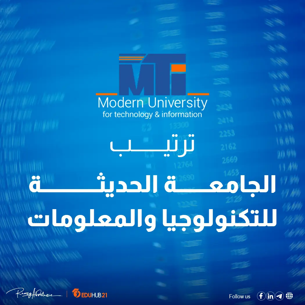 يبحث العديد من الطلاب في مختلف الدول العربية عن ترتيب الجامعة الحديثة للتكنولوجيا والمعلومات، حيث تعد الجامعة الحديثة للتكنولوجيا والمعلومات (MTI) من الجامعات الخاصة المهمة في مصر في مجال تكنولوجيا المعلومات والهندسة.