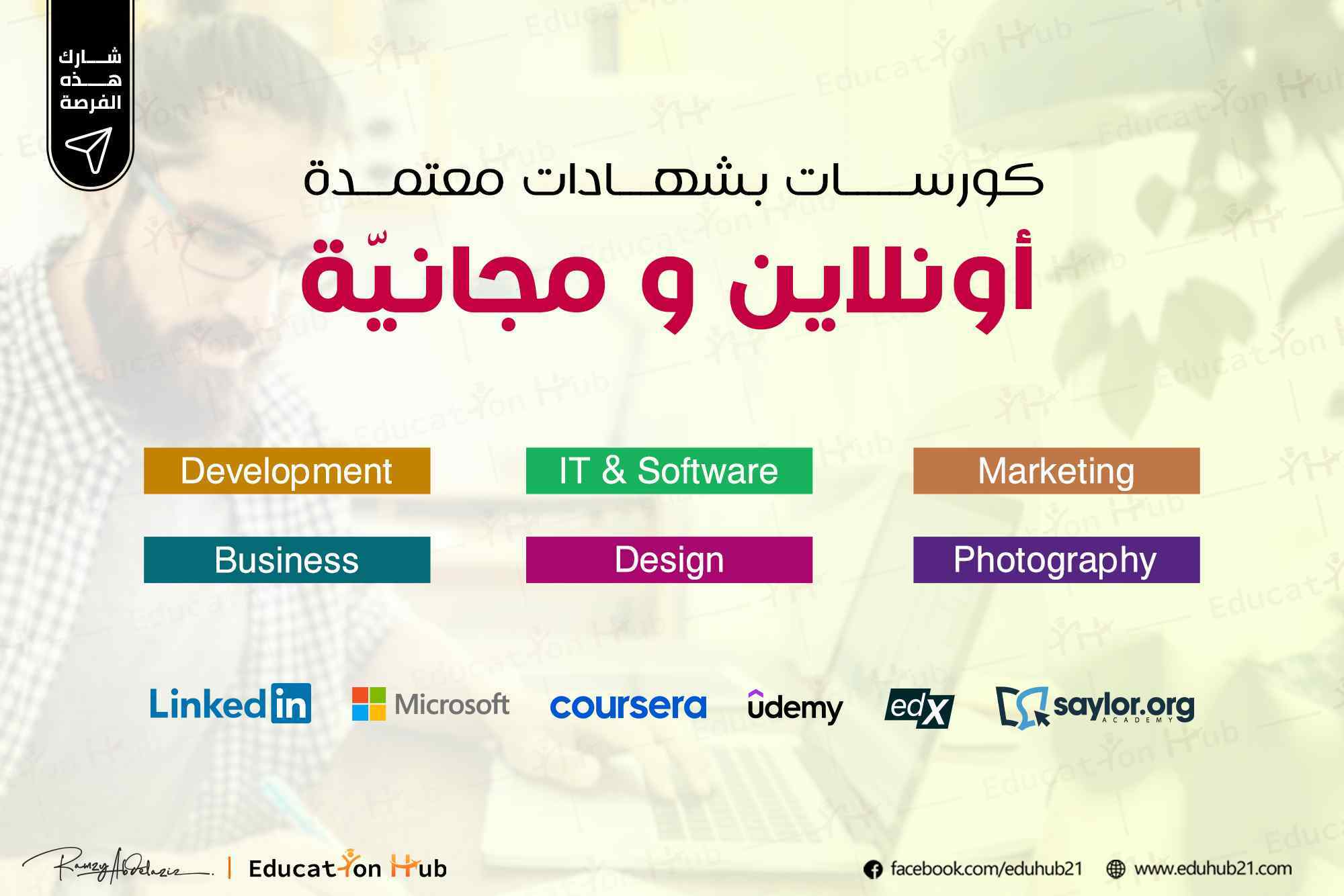 كورسات اون لاين وتدريبات مجانية عن بعد بشهادة معتمدة في التصميم المواقع والتطبيقات والبرمجة وادارة الاعمال وهي مجانيه بالكامل للتدريب واكتساب الخبرة. Education Hub