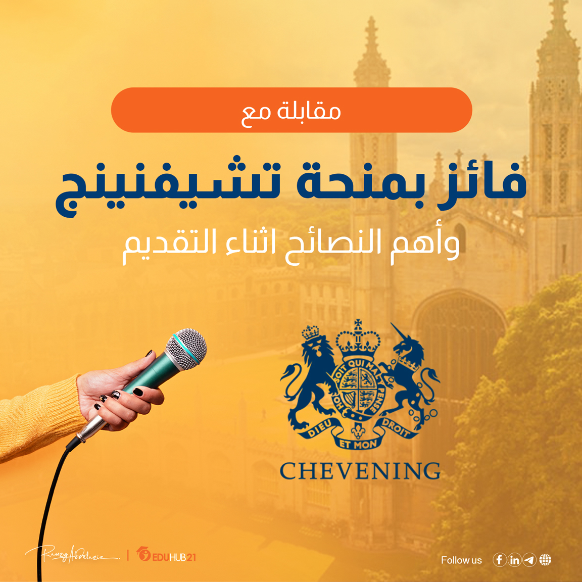 مقدم المقابلة:هناك نقطة مهمة يجب ملاحظتها وهي أن الفائز بالمنحه لم يحصل على منحة تشيفنينج  من المرة الأولي ولكن بعد أن واجه الرفض مرتين، ظل يحاول مع الاستفادة من الدروس السابقه وبعد هذه الاحباطات، نجح أخيراً في محاولته الثالثة عام 2015