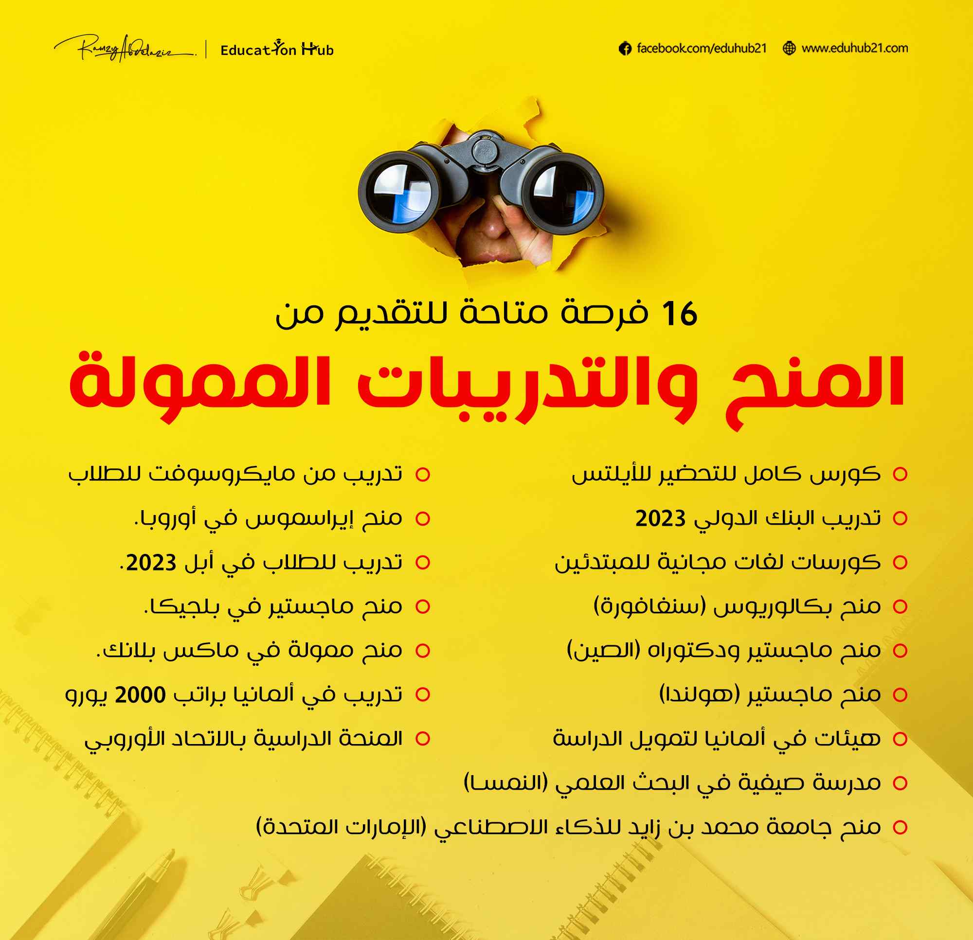 منح وتدريبات ممولة ومازال متاح التقديم عليها. لمن يرغب في السفر للخارج والحصول على منحة دراسية للبكالوريوس او الماجستير او الدكتوراه او تدريب صيفي.