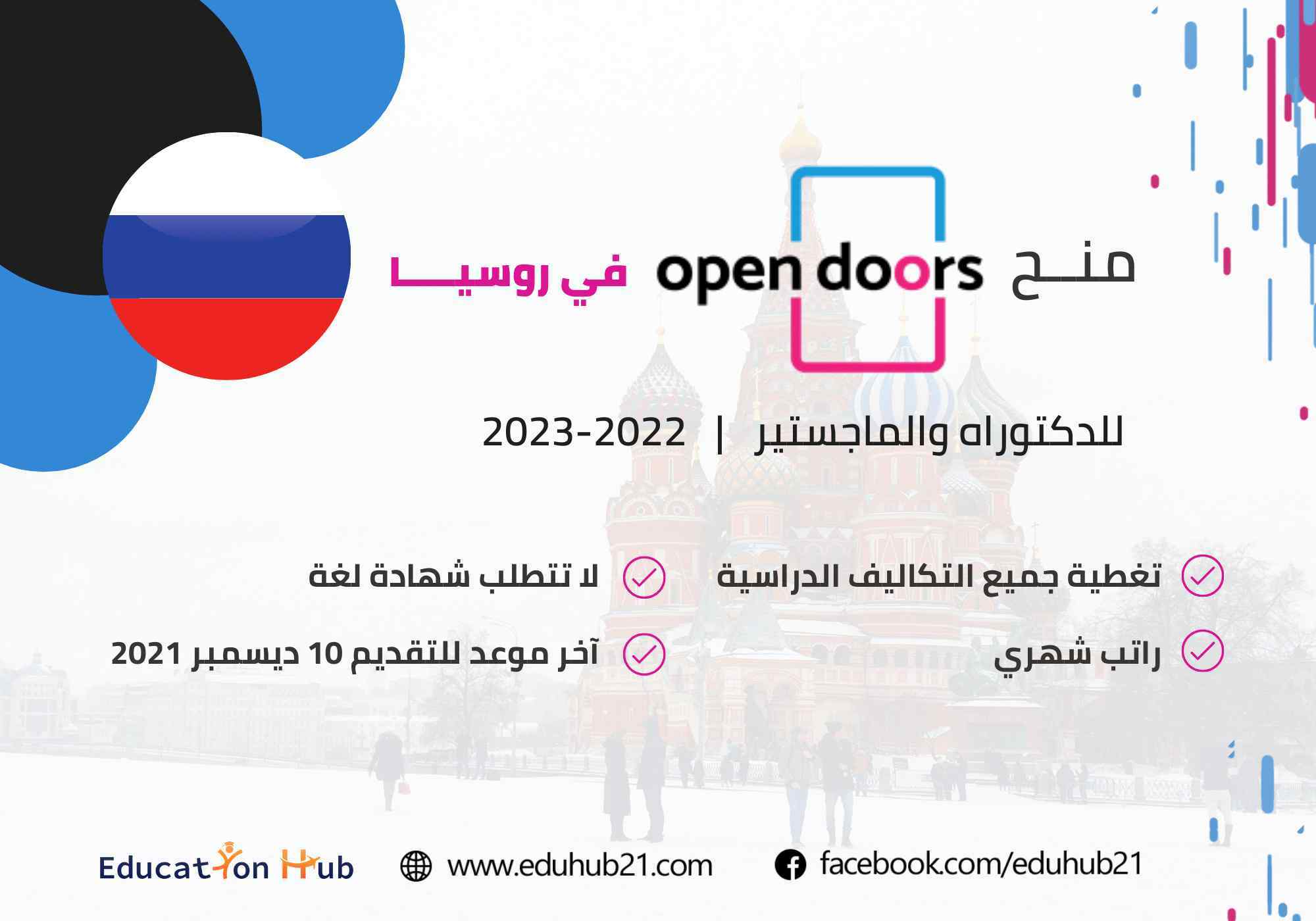 يقدم برنامج Open Doors منح مدفوعة التكاليف للدراسة في إحدى الجامعات الرائدة في روسيا. الهدف من هذا البرنامج هو منح الطلاب الموهوبة من جميع أنحاء العالم فرصة لإكمال درجة الماجستير أو الدكتوراه مجانًا في روسيا. الفائز في هذه المنحة يمكنه اختيار جامعة من بين 500 جامعة روسية ومن ضمنهم 21 جامعة رائدة، ولغة الدراسة هي اللغة الروسية أو الإنجليزية. يعتبر هذا هو العام الخامس لبرنامج Open Doors والجديد لهذا العام أن درجة الدكتوراه متاحة في جميع المجالات، والمميز ايضًا في هذا البرنامج أنه لا يتطلب شهادة إثبات لغة، لكن إذا توفرت يمكنك إضافتها. منح Open Doors تعتبر من المنح المهمة لأنها توفر لك العديد من المجالات للدراسة، بالإضافة إلى الحرية في اختيار الجامعة التي تود الدراسة بها.